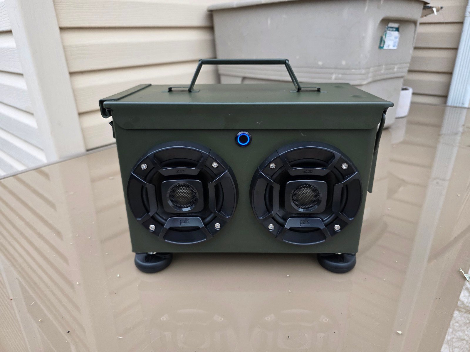 • Brand new custom built ammo can Bluetooth speaker with USB fast charging. Let my start and and tell you I spent a lot of time on this can to make it perfect and sound awesome. The can itself is a brand new military style .50-cal heavy duty can. The dimensions are 7-3/8 x 12-1/8 x 5-5/8. In all my builds I only use the highest grade components with the best build quality to get the best sound possible. To get the best sound you must first sound deaden the box. I have put 2 layers on the front and back of the box because there the metal is the thinest and that causes vibration and that's the last thing you want in a Bluetooth speaker for sound quality. All holes were hand drilled and chamferd for perfect component fit. Now let's get into the components used in this build. The speakers I decided to use where the Polk DB402 2-Way Coaxial Marine Certified car speakers with 135W peak power and 45 watts rms. I've been using these speakers for a long time now are they sound awesome and get l